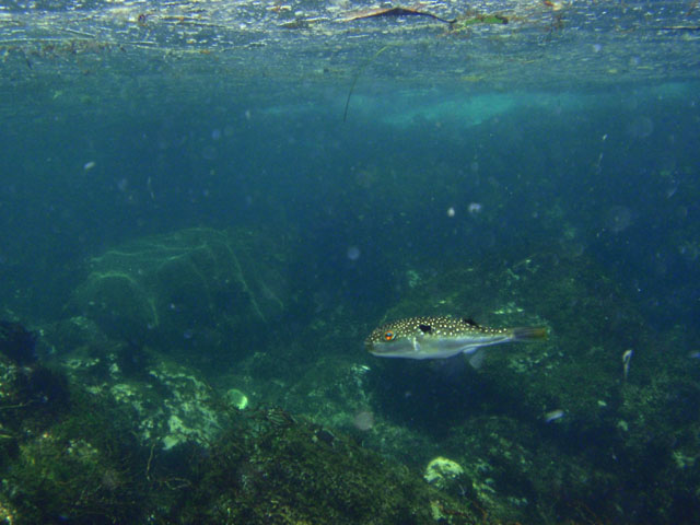 少しあおって,水面を入れてみました。 いろいろ浮いてて,イマイチですが(汗) クサフグだけが,妙にくっきり。不思議。
