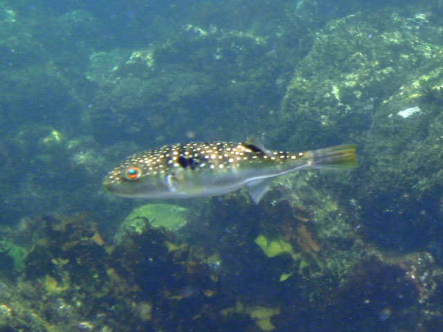 なかなか立派なハコフグが,水深50cmにいました。 ひたすら追いかけてたら, しまいには,岩の下のくぼみに隠れて, 出てこなくなりました(汗)
