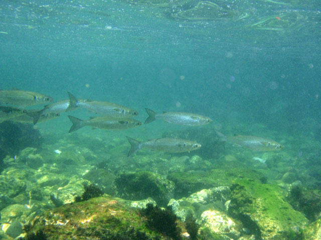 先頭がボスかな? 1mにも満たない浅場で,縦長の群れで泳ぎます。 狭っくるしいとは,思わないのかな?