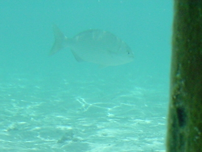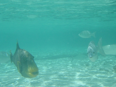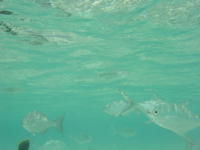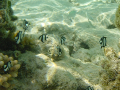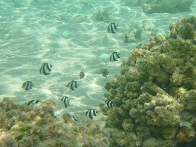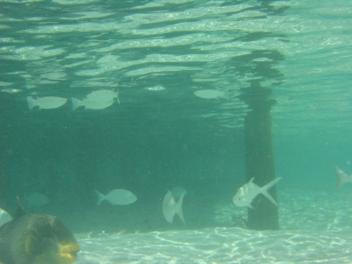 左下に写ってるモンガラは,ほぼ毎日,水上コテージ周辺に来ました。 エサをおねだりするお茶目なヤツです♪ 尾がV字のヤツがコバンアジです。