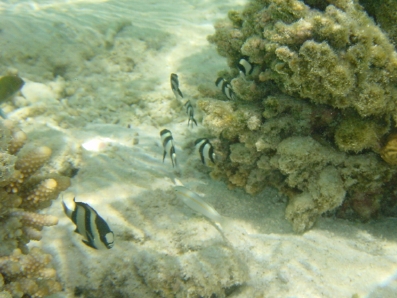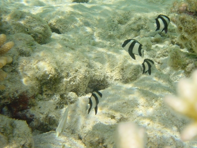 珊瑚周辺にミスジリュウキュウスズメダイの幼稚園がありました♪ 3本の黒いスジが愛らしいです♪ 白っぽいヤツは,デバスズメダイだと思います。