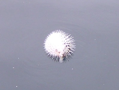 船着き場の水面に,ハリセンボンが浮いてました。