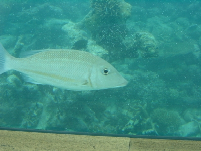 左上に反射して写っているのは,お魚の名前を記したボードです。