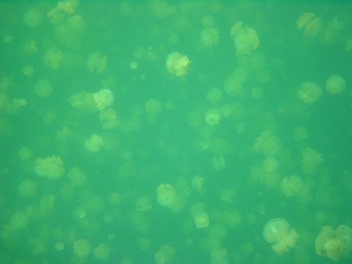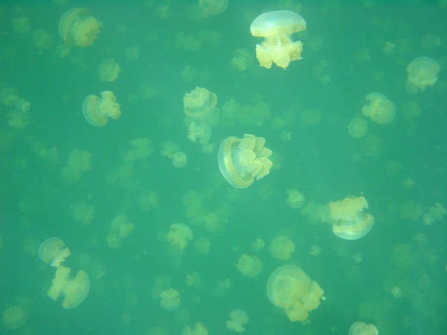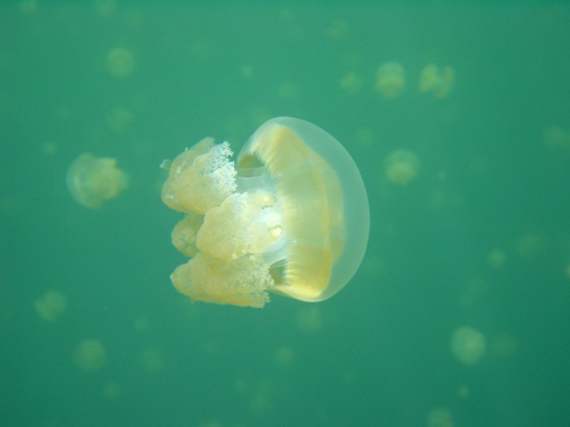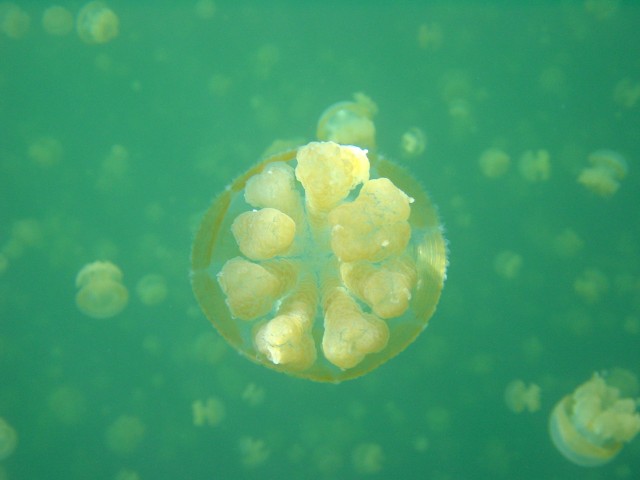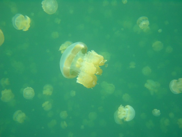 クラゲが数十万匹住む湖にやってきました。 タコクラゲの仲間でGolden Mastigiasというそうです。