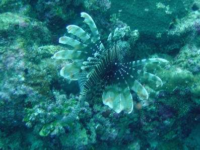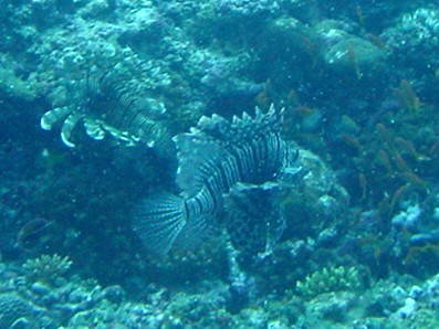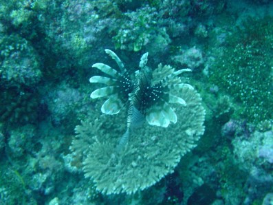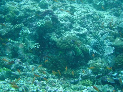 キンギョハナダイに囲まれているミノカサゴを発見しました。