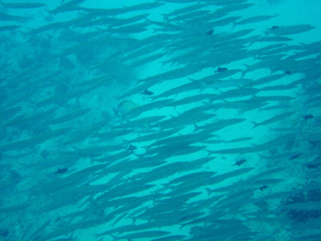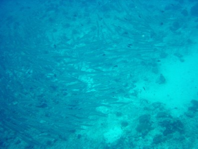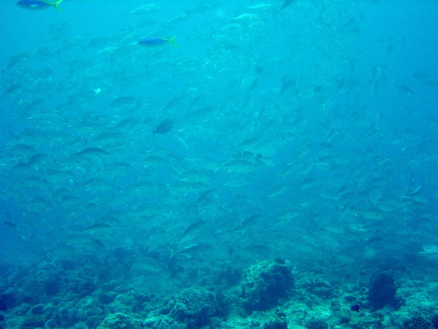 これは別の群れ。画面いっぱいギンガメアジ! 何匹いるかな? ちなみにギンガメアジは, 正確には「ギンガメ・アジ」ではなく「ギンガ・メアジ」です。