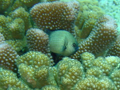 撮ろうとして必至になってたら, フタスジリュウキュウスズメダイの縄張りを侵してしまったようで, カメラに対し,猛烈にアタックされました。 思いっきり撮影を邪魔され,結局こんな写真しか・・・