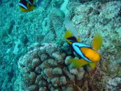 イソギンチャクから離れて泳いでました。 ちなみに,ミクロネシアの固有種で, 鰭が黄色いため,黄色で縁取られたように見える点が特徴です。 2本の白い線は,少し青みがかっていて,遠目にも,よく目立ちます。