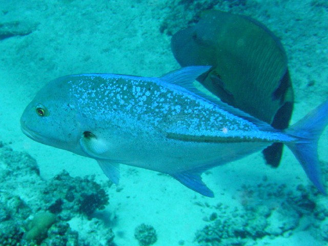 残る2匹は,カスミアジと,奥に写るナポレオンです。 カスミアジはキラキラ光ってキレイですよ! ちなみに,毒があるので食えません。