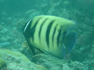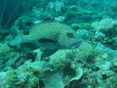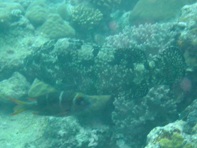 赤っぽいお魚が,ヨコシマクロダイです。 実はその真上がアカマダラハタです。岩ではありません(汗)