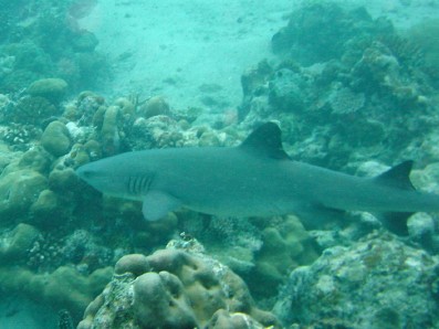 水路の中でサメ発見。 ガイドさんはグレイリーフシャークだっていってましたが, これは,ホワイトチップですな。 それとも,グレイリーフシャークが別にいたのか?