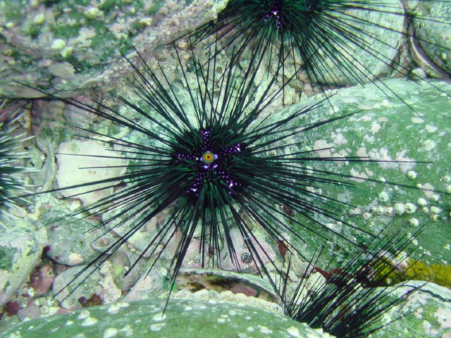 ガンガゼ,初めて見ました。トゲトゲくん。 あちこちにいました。よく見るとキレイ。 歩いてる姿や,排泄している姿(?)も見ました。