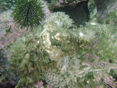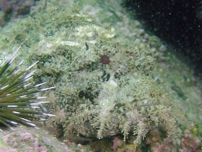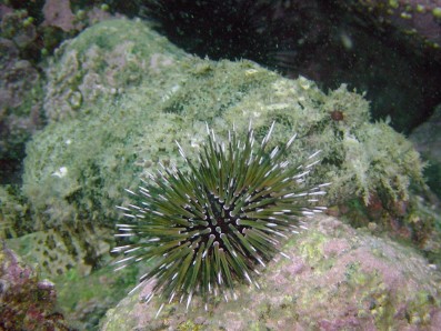 中央のウニは,ツマジロナガウニかな。 この写真の主役は,その後ろ! ほら,ウニの右上に目玉が見えるでしょ!