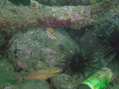 キタマクラを追って,手前にピントが合いました。 イシモチとガンガゼと,空き缶・・・ ちゃんとゴミ箱に捨ててほしいですね。