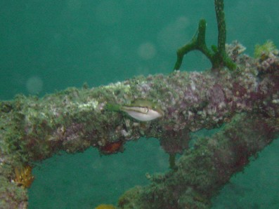 小さいミギマキ発見! 後ろに見えるのは,ガイドさんのフィンです。 近くに小さいタカノハダイがいましたが,写真撮れなかった。