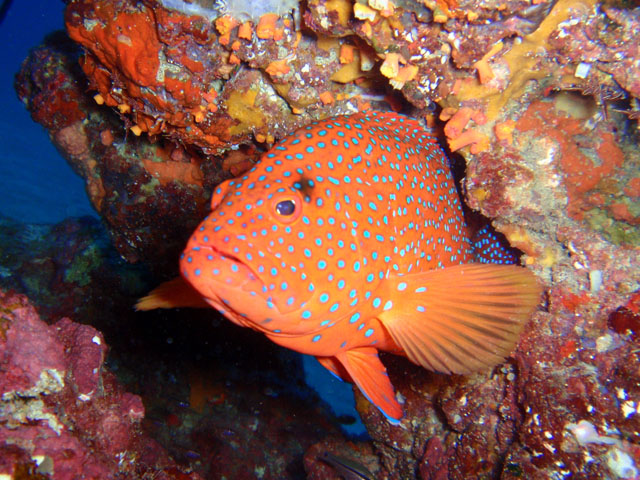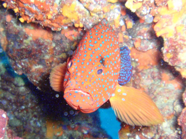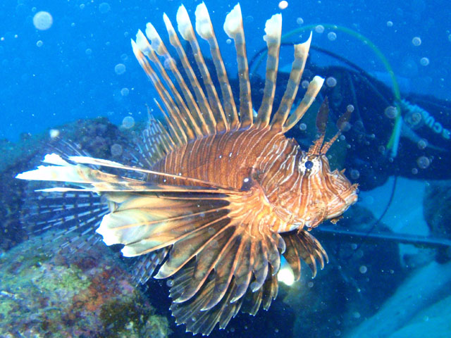 沖縄の海での最初の被写体です。 ホントは,直前に見たフタイロカエルウオを撮りたかった・・・ すぐに隠れちゃったので,ハナミノカサゴでガマン。 真っ青な海でも,ハレーション出ますね・・・