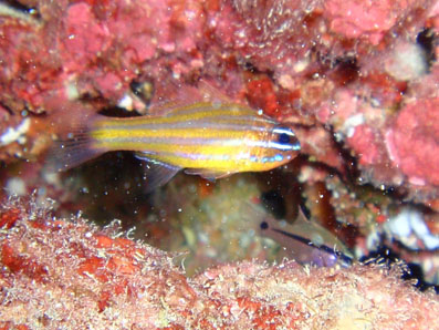 キンセンイシモチは,あちこちにたくさんいました。 1枚くらいキレイに撮ろうと思ったんですが, 他の被写体に忙しく,結局いい加減に・・・ 後ろにいるお魚は,ヒトスジイシモチかな?