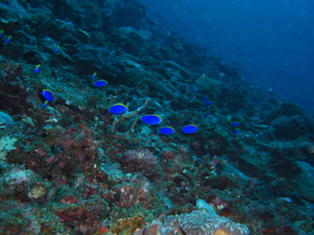 もうひとつの目玉! セナキルリスズメダイのコロニー! こちらも18mくらいで見られます。 普通は,もっと深いところに行かないと見られないらしい。 アホほどいました! こんなに集まるんですねぇ