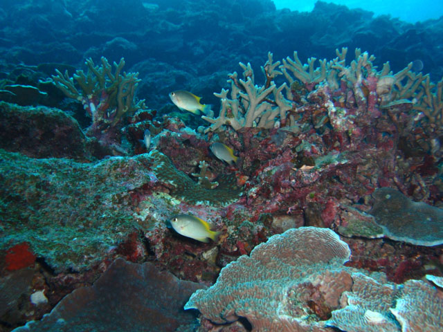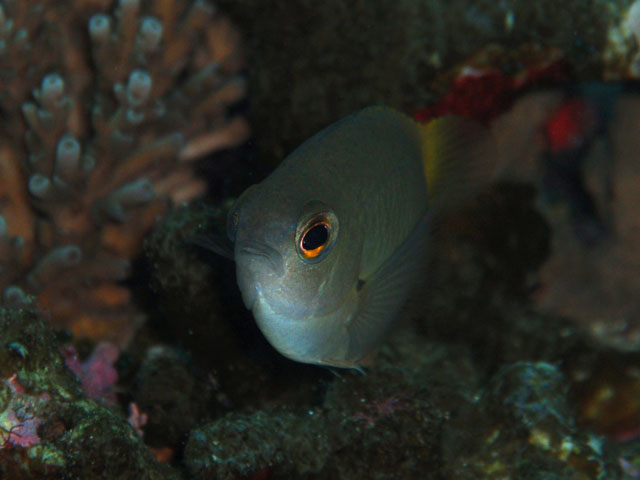 この子は,別のところで撮りました。 ちょっと暗いけど,まぁまぁよい感じかな。 今回,スズメダイの撮影には力を入れました。 今まで,あまり上手に撮れてないからね。