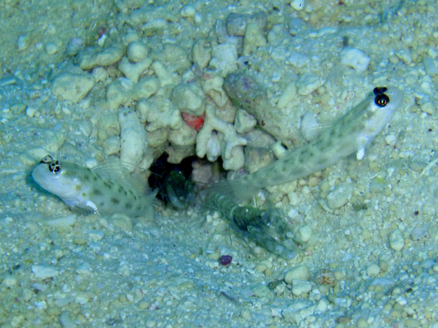 ひとつの穴から2匹のハゼが顔を出していたので, 1枚,2枚と写真を撮ってると,エビも2匹出てきました! 2家族同居♪