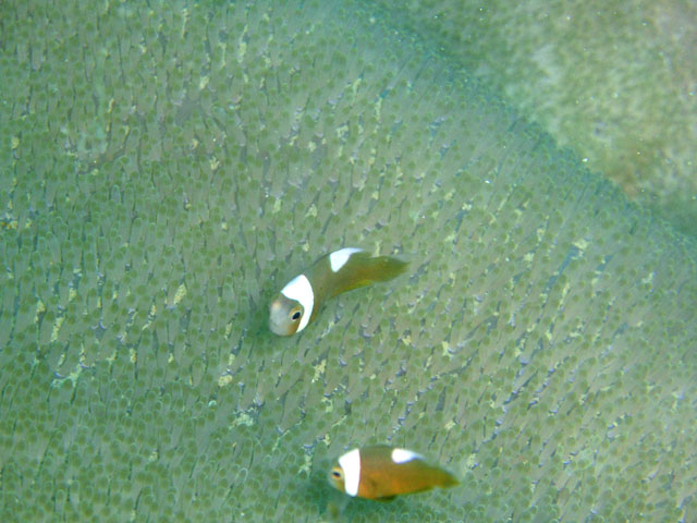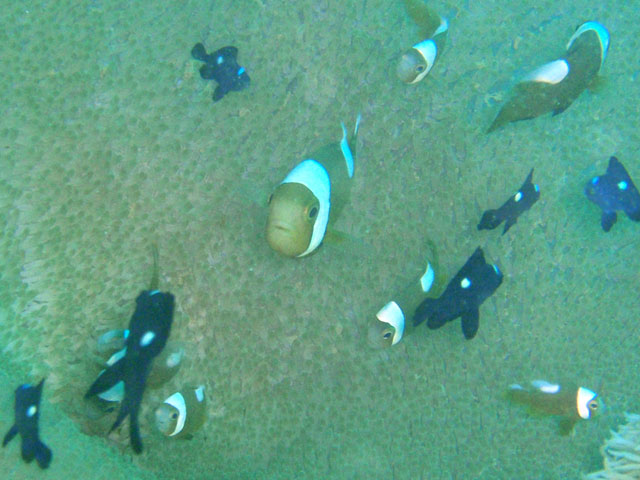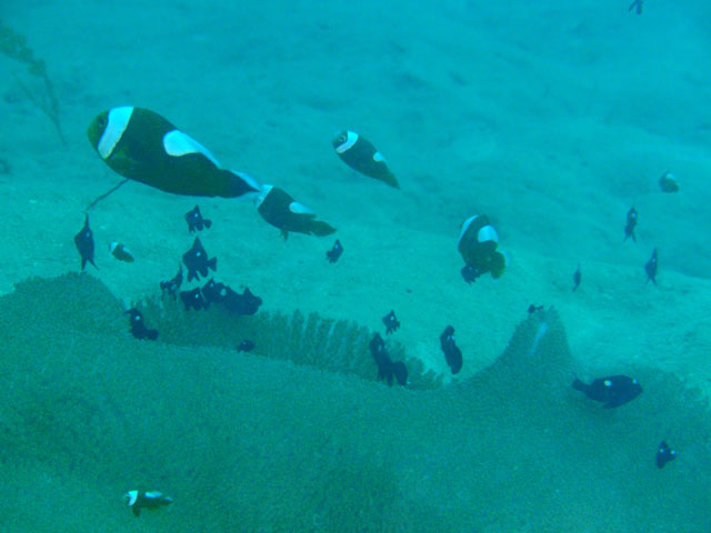 大小様々なトウアカクマノミが, テーブル状のイソギンチャクの上にたくさんいました。 なんでフラッシュたけてないんだぁ!? 強制発光だったハズなのに・・・