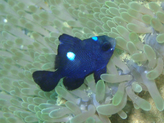 トウアカクマノミと一緒にいたミツボシクロスズメダイも, もちろん撮りました! まぁまぁ可愛く撮れた♪ もうちょっと眼がハッキリ写るといいんだけどなぁ