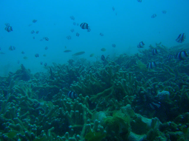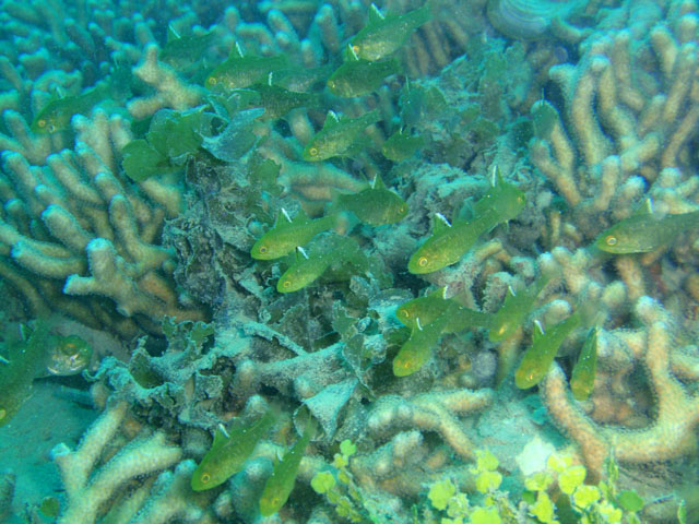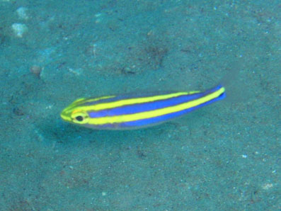背景に合わせ,目立たないカラーリングの魚が多い中, この子だけは,目がさえるようなストライプ! すごくキレイでしたよ! 黄色いラインの入り方からキツネウオの幼魚と判明。