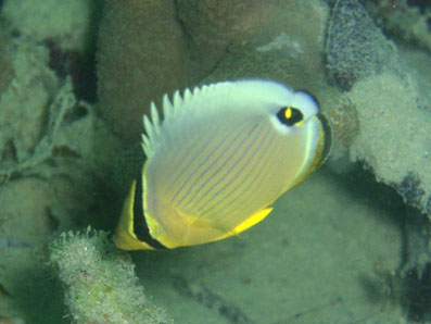 チョウチョウウオも撮ってみました。 尾鰭の付け根に黄色い斑紋がありますが, オトナになるとなくなるそうです。