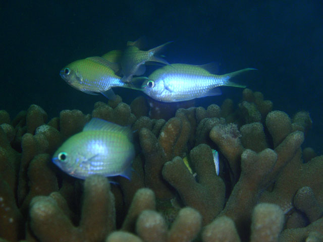 エダサンゴの上は,スズメダイだらけ! まずは,モンツキスズメダイ!(たぶん・・・) 特徴は,胸鰭の付け根の黒い斑紋(だけ)です。