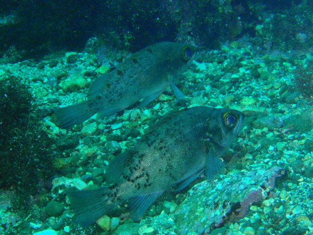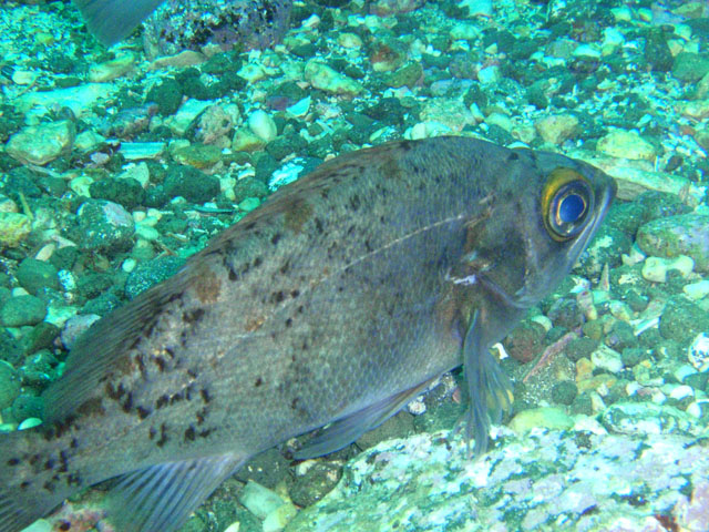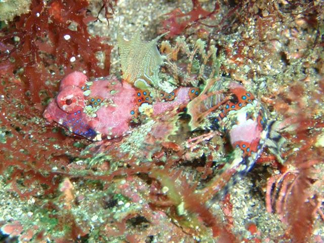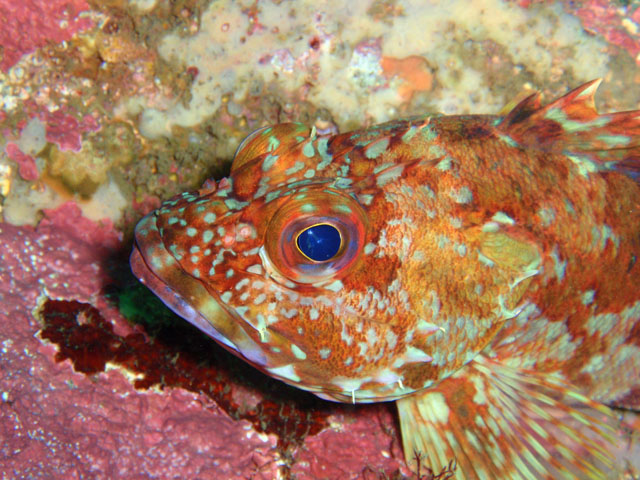 岩に斜めにへばりつくカサゴ。 なんでそんな不自然な体勢なんでしょ? 目はこっちを向いてますが,微動だにしません。