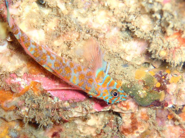 やっと見つけた,ちっこいダテハゼ! 引っ込めたくなかったので,写真はこの角度のみ。 このあと,少し移動して,離れて眺めてたら, キュウセンがつついて,引っ込みました。