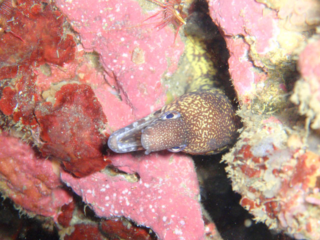 小さいウツボ! サラサエビと比較すると,大きさがイメージできるかな? 臆病なのか,目があったら,引っ込もうとしました。 逃げないでよ!