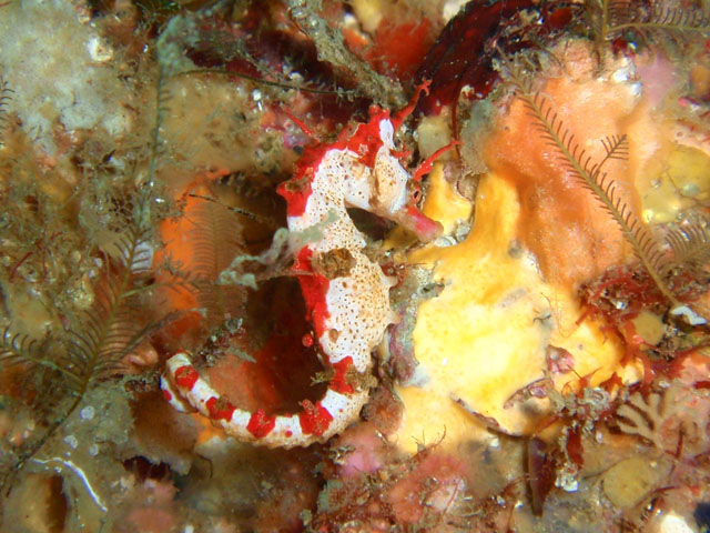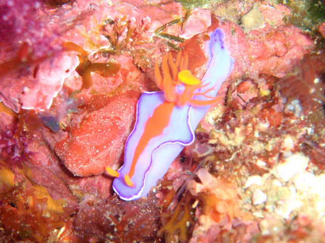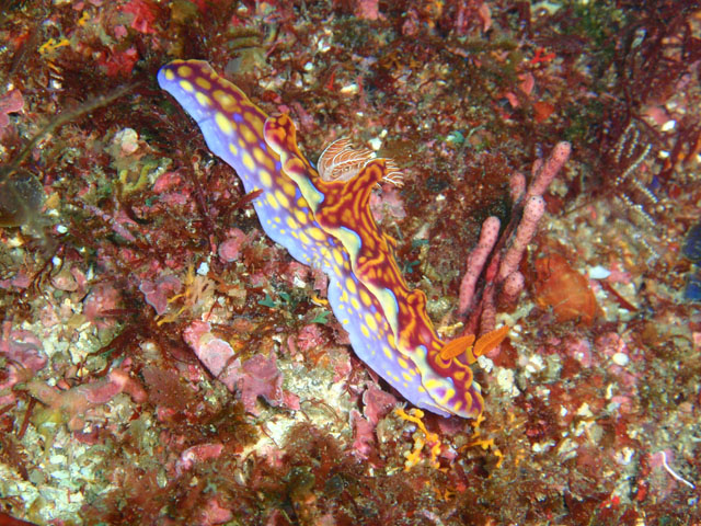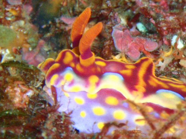 こちらがニシキウミウシ(の子供?)。 昔はフタイロニシキウミウシと呼ばれていたそうです。 フルーツポンチウミウシとともに, 今はニシキウミウシに分類されています。