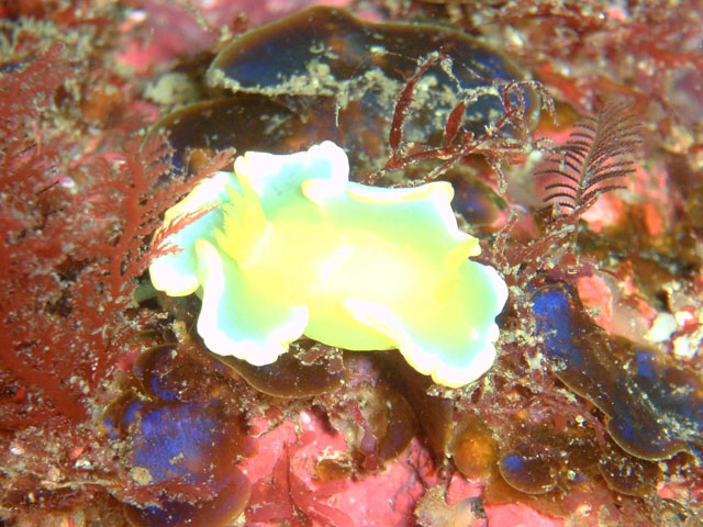 名前,わからんけど,時々見かける黄色いウミウシ! と,思って撮ってましたが,初物でした(汗) 白とか黄色のウミウシは光って写るので, 露光補正すると良いそうです。なるほど。