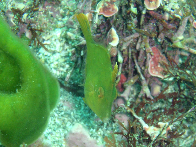 ロープ伝いに移動中,チビのカワハギを発見。 のんびり見ている時間はなくて,慌てて撮影。 う〜ん。カワイらしさが伝わらない写真だ・・・